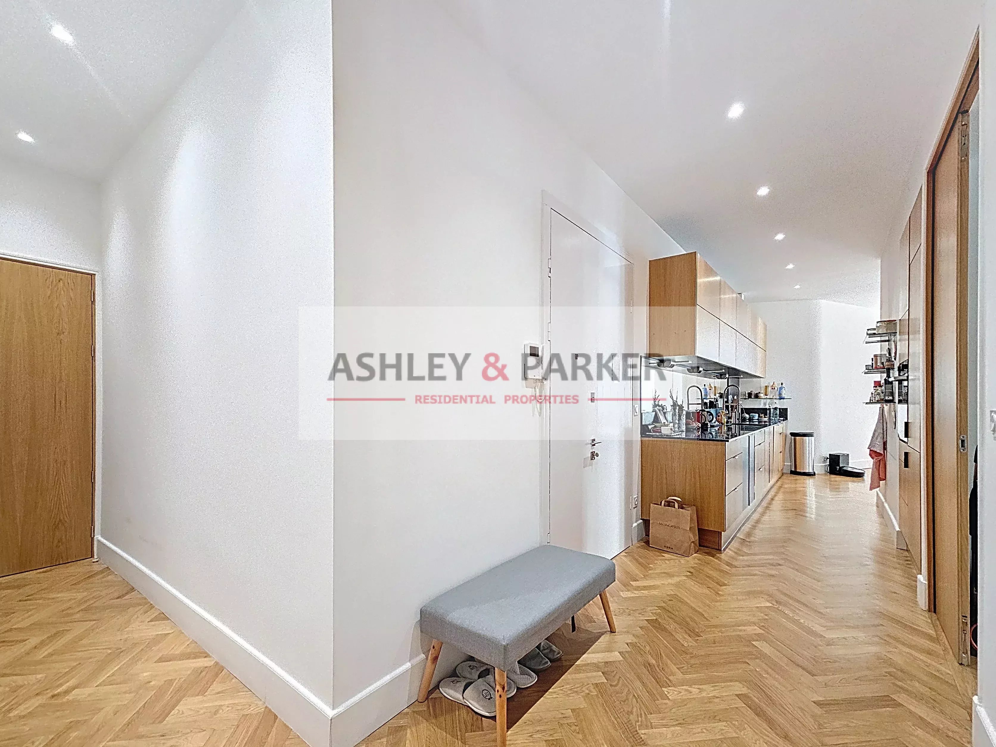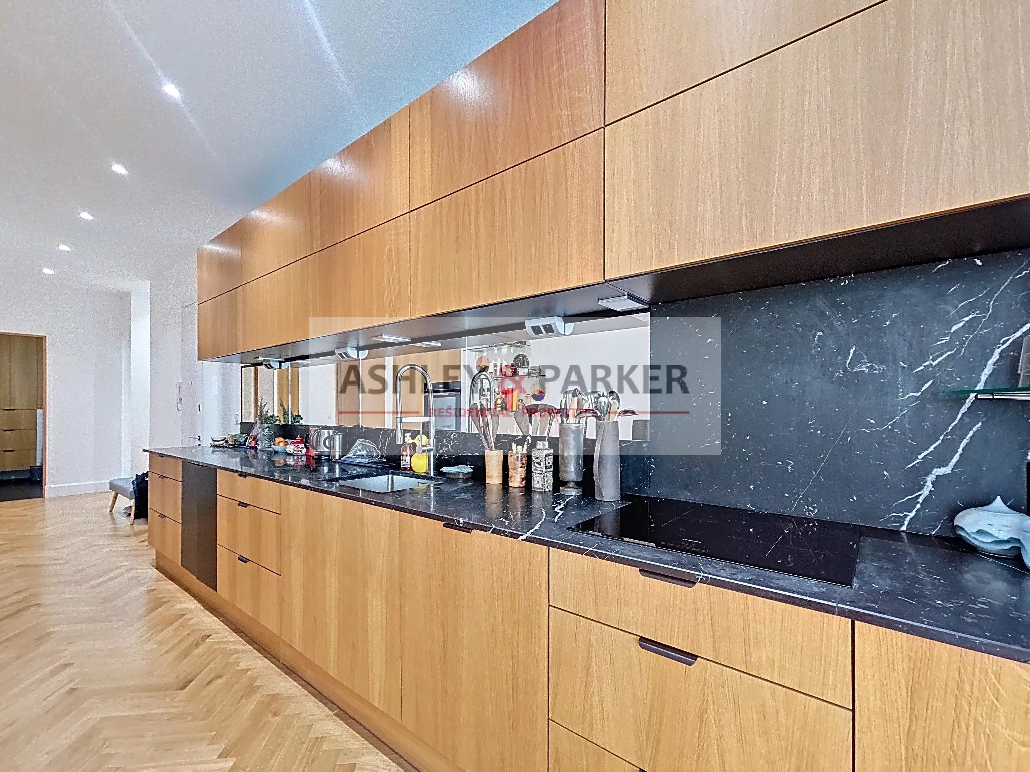 The vast, south-west-facing living room is remarkably bright and opens onto high windows, enhancing the herringbone parquet flooring and period features, including TWO CHEMINEES. The reception area combines classic elegance with contemporary comfort, and is extended by a sleek EQUIPPED kitchen.