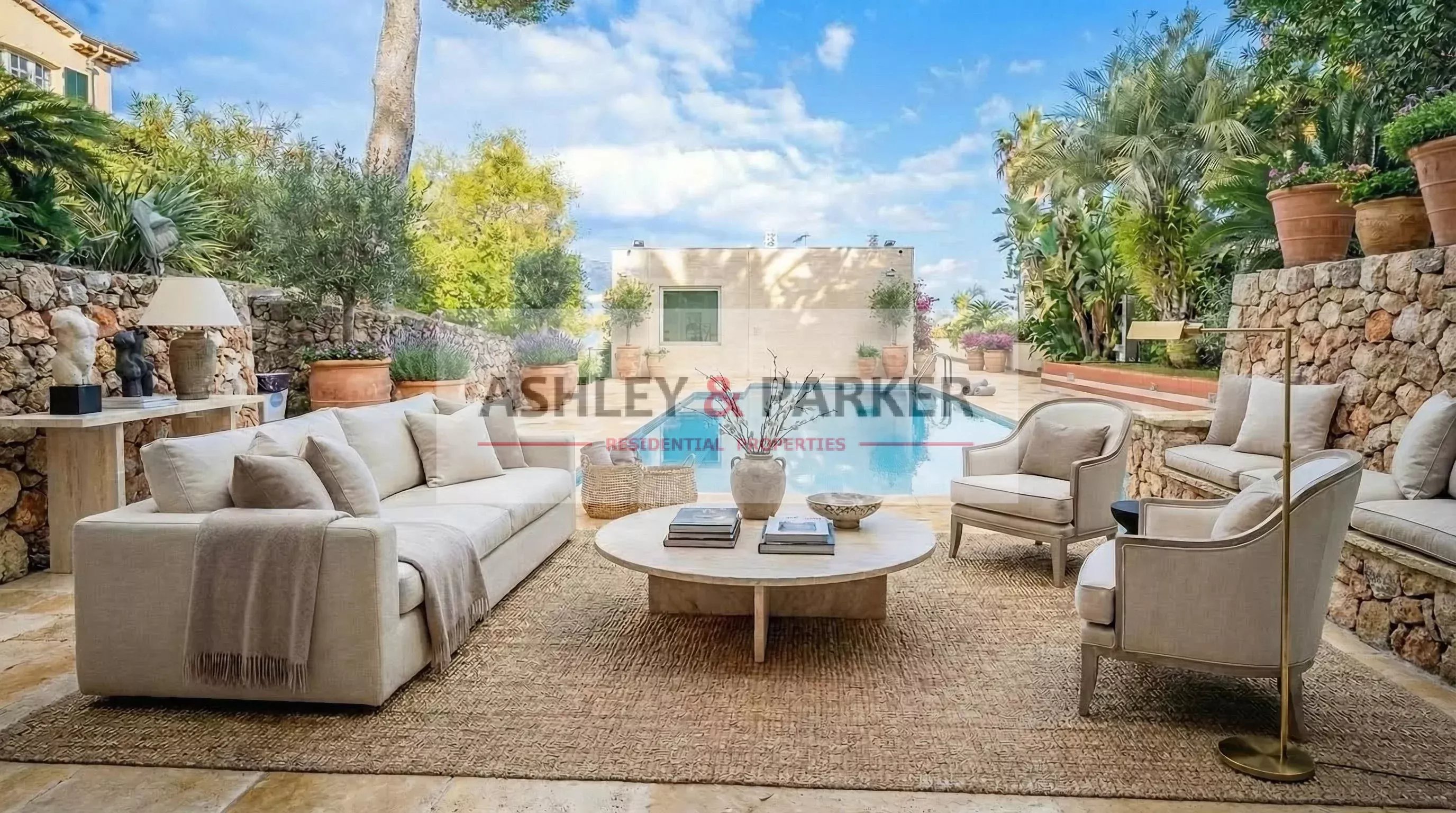 Le jardin méditerranéen paysagé entoure la propriété et propose plusieurs espaces de détente ainsi qu’une piscine privée avec terrasses ensoleillées.