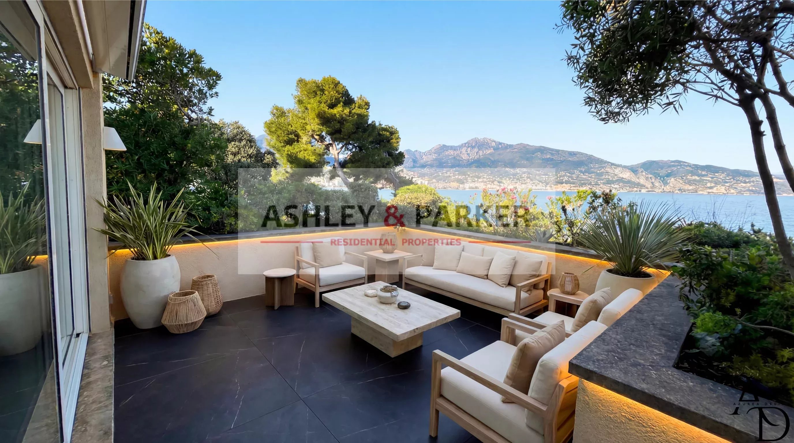À l’extérieur, un magnifique JARDIN MÉDITERRANÉEN PAYSAGÉ DE 1.210 M² entoure la propriété et accueille une PISCINE PRIVÉE avec TERRASSES ENSOLEILLÉES, parfaites pour profiter du climat exceptionnel de la Riviera.